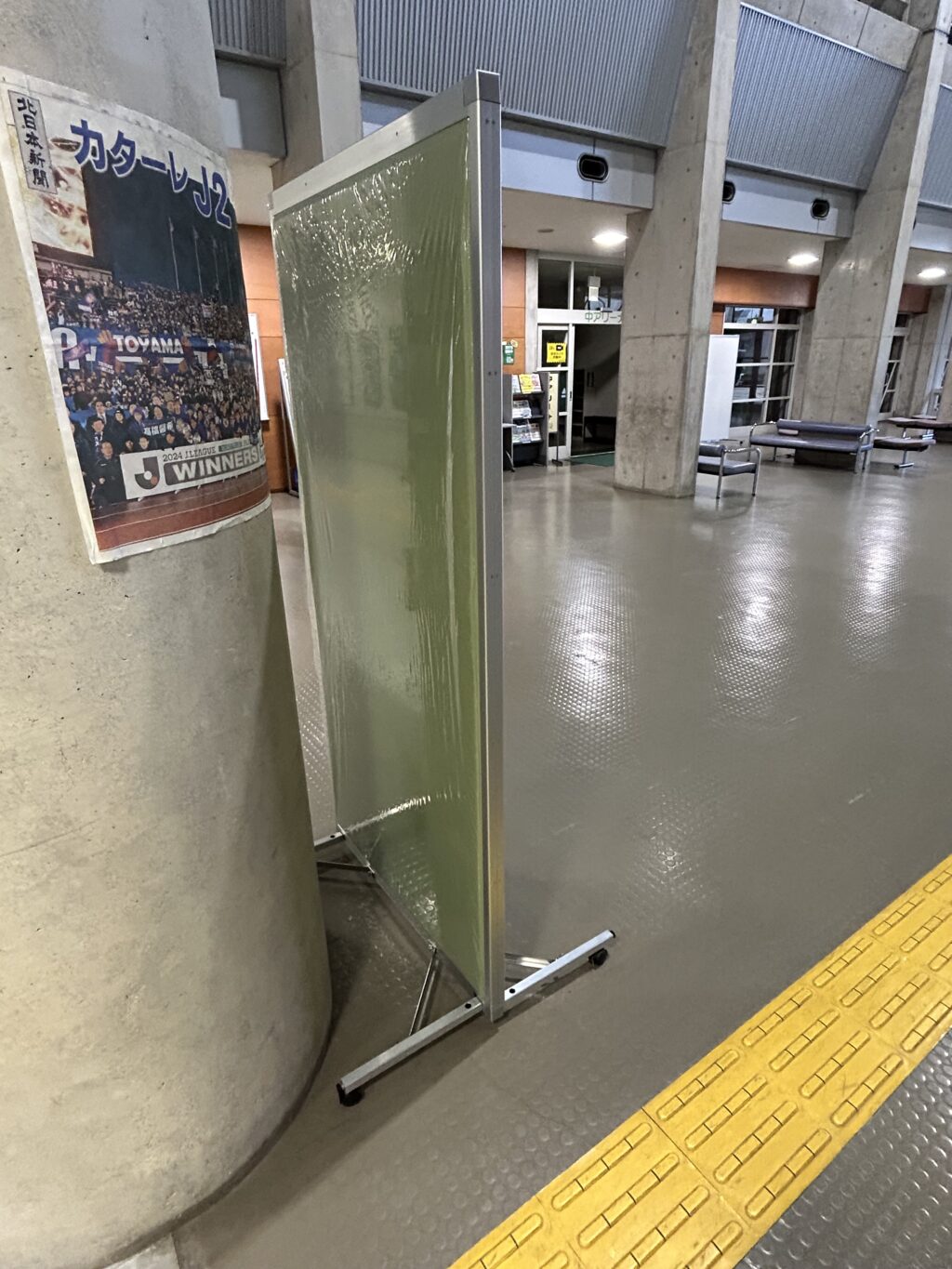 富山県で導入頂きました富山県西部体育センターのアリーナ入り口エントランスホールで、ホワイトボードや掲示板として有効活用頂いています!